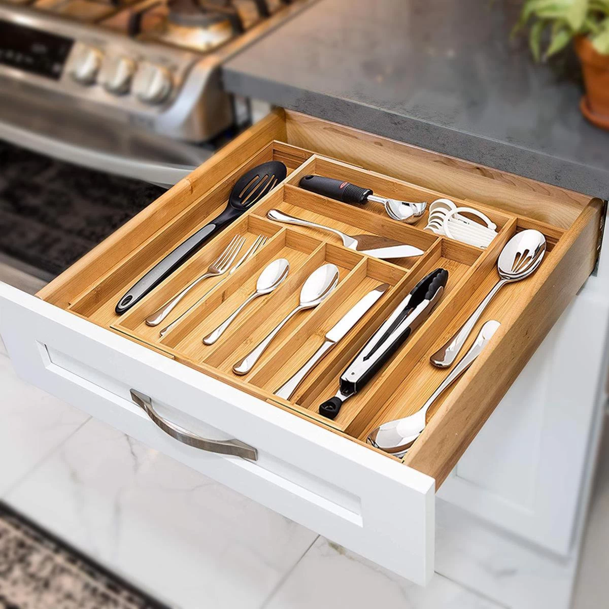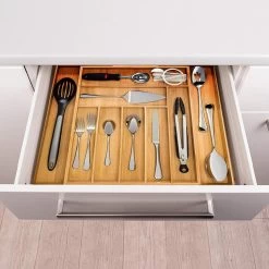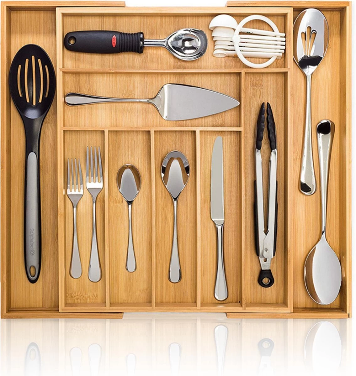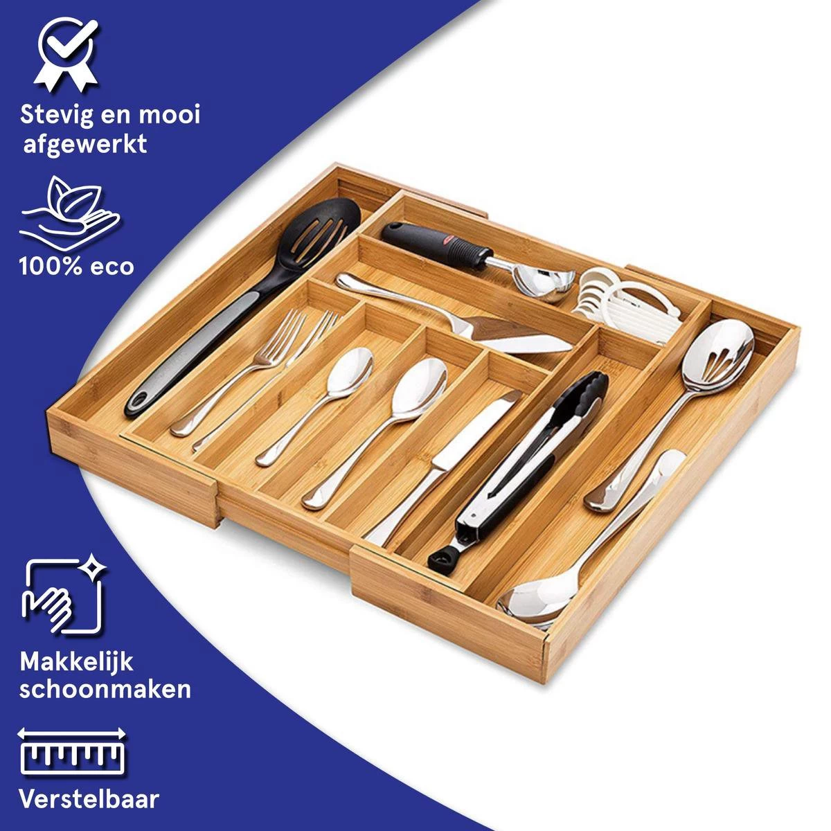 Opgeruimd staat netjes! Deze bestekbak van 100% bamboe hout is uitschuifbaar tot 9 ruime vakken. ‘’Eindelijk een bestekbak met genoeg ruimte voor al jouw kookspullen’’.