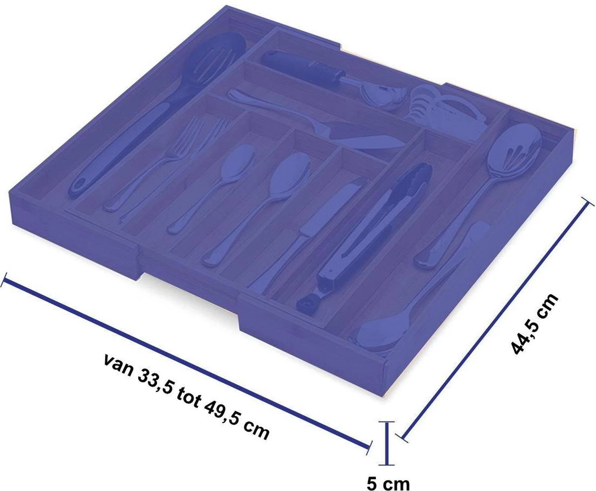 Deze bestekbak is in de breedte verstelbaar van 33.5 tot 49.5cm. Bij 33.5cm heeft de bestekbak 7 ruime vakken. Uitgeschoven tot 49.5cm heeft deze bestekbak 9 ruime vakken. Hierdoor pas je deze bestekbak gemakkelijk aan naar jouw wens!