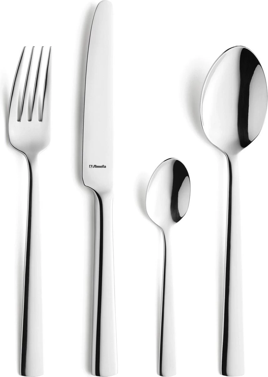 De Moderno lijn van Amefa is strak en subtiel uitgevoerd en heeft daardoor een moderne en tijdloze uitstraling.Deze bestekset Moderno van Amefa, bestaande uit 24 stuks bevat: 6 Tafelmessen 6 Tafelvorken 6 Tafellepels 6 KoffielepelsDe kwaliteit van AmefaKwaliteit staat bij Amefa hoog in het vaandel. Deze 24-delige bestekset is met grote zorg en precisie vervaardigd en is gemaakt van chroomnikkelstaal, beter bekend als 18/10 roestvrij staal. Door de hoge kwaliteit van 18/10 staal zijn de producten corrosie bestendig en hebben een duurzame glans (indien de onderhoudsinstructies in acht worden genomen). Producten van 18/10 roestvrij staal kunnen gereinigd worden in de vaatwasmachine.Mist u nog iets in uw bestekset? Bekijk dan de volledige collectie van Amefa Moderno. Ook voor ander bestek van Amefa bent u bij ons aan het juiste adres. Bekijk onze gehele Amefa collectie!