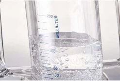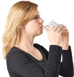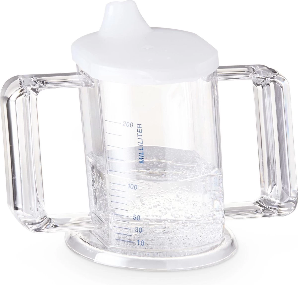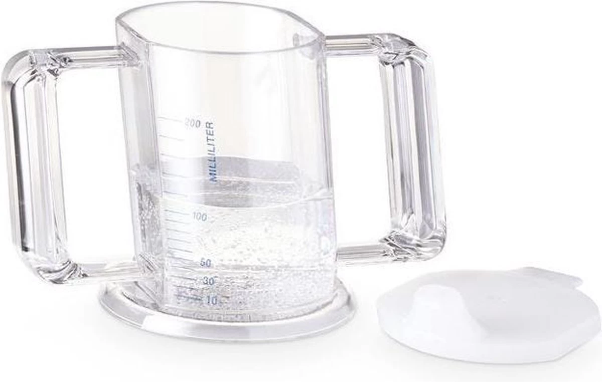 De rand van de HandyCup is schuin, zodat men kan drinken zonder het hoofd naar achteren te buigen en zonder dat de neus de rand van de beker raakt. De beker is transparant, zodat de hoeveelheid vloeistof te zien is en wordt geleverd met deksel.