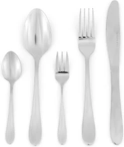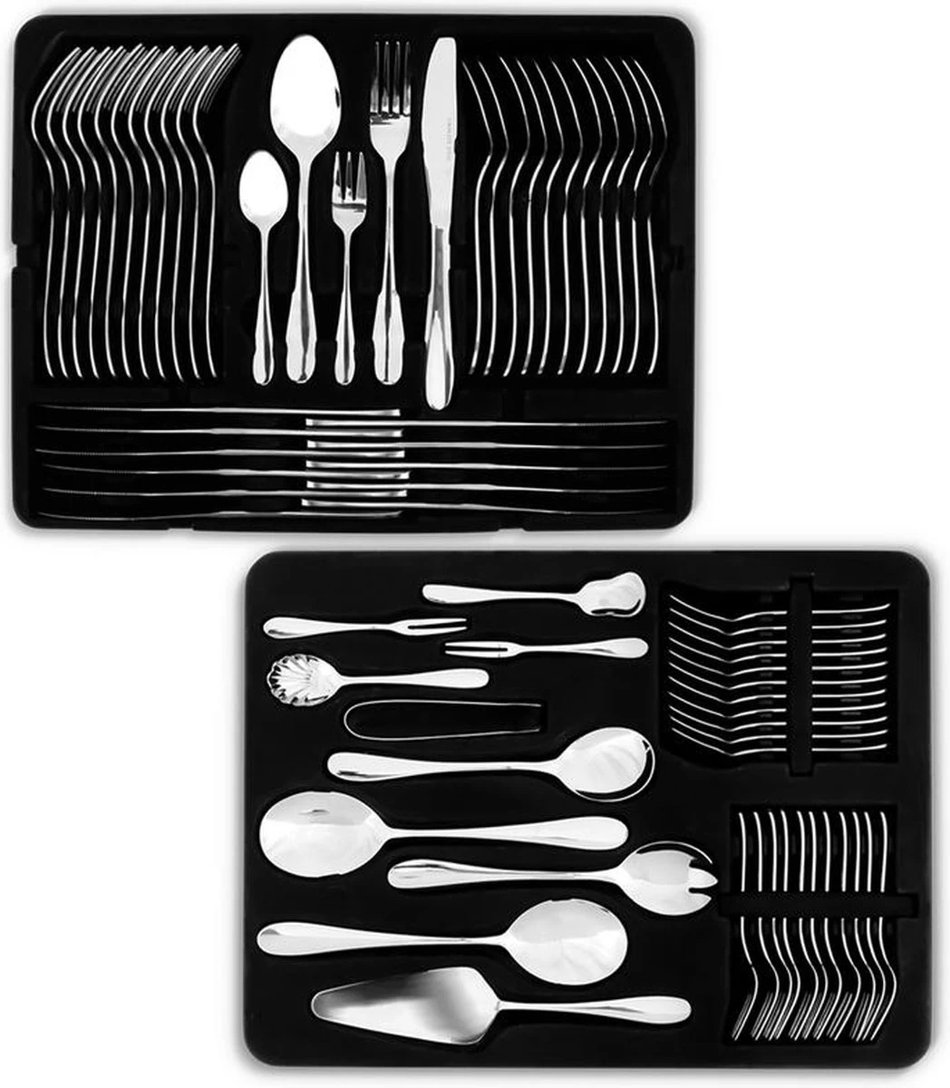 12 lepels, 12 vorken, 12 messen, 12 theelepels, 12 taartvorkjes, 2 opscheplepels, 2 vleesvorken, 1 saladelepel, 1 saladevork, 1 taartschep, 1 suikerlepel, 1 roomlepel, 1 tang voor suikerklontjes