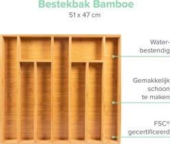 De bestekbak is zeer slijtvast door het zeer sterke bamboe hout en geeft een goede bescherming voor de voorwerpen die in de organizer geplaatst zullen worden. Bij de normale bestekbakken zal ongetwijfeld voorkomen dat de messen door het plastic heen prikken of dat de kwaliteit na enkele weken afneemt. Dit probleem heb je niet met de bamboe bestekbak.