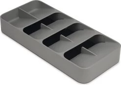 Bestek opbergen doe je op een praktische manier met deze bestekbak gemaakt van siliconen (kunststof). De neutrale, grijze kleur past goed bij elk keuken interieur. Je kunt kiezen uit de kleine lade indeling met 5 compartimenten, of de grote versie met 8 compartimenten. De afmetingen zijn: