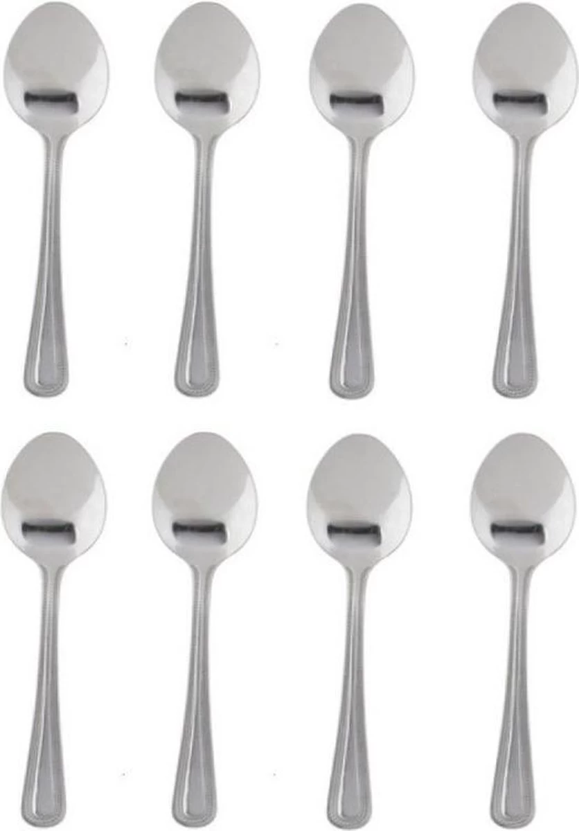 8x Thee/dessert lepeltjes. Deze thee/dessertlepeltjes zitten verpakt per 4 stuks. U ontvangt 2 verpakkingen. Formaat: 15 cm. Materiaal: RVS. Uitzet – Bestek. Let op voor theelepels zijn ze best groot maar kan wel in een hoog glas voor honing etc.