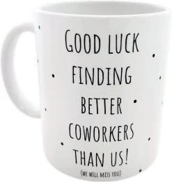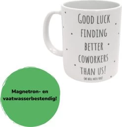 Gaat je favoriete collega jullie verlaten? En ben je op zoek naar een leuk afscheidscadeau voor diegene? Dan hebben wij wat leuks voor jou. Wij bieden een afscheidsmok aan met de tekst: ”Good luck finding better coworkers than us! (we will miss you)”. De keramische mok heeft een inhoud van 300 ml en is dus groot genoeg voor een grote kop koffie, thee of melk.