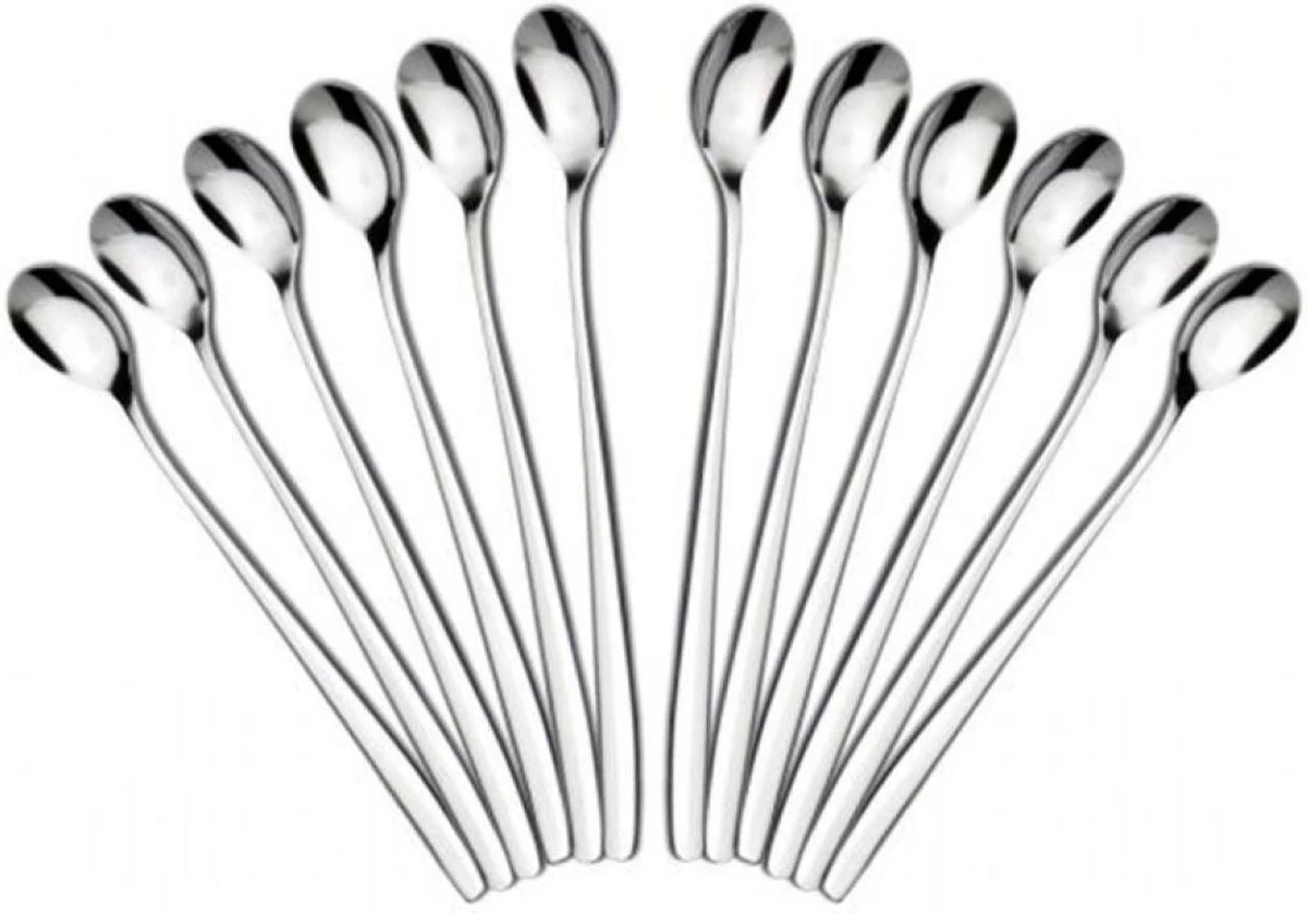 Set van 12 roestvrijstalen Latte Macchiato lepeltjes. Handig om in lange glazen te roeren of uit te scheppen.