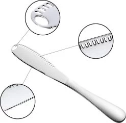 Bestek moet veilig te gebruiken zijn, dat geldt ook voor botermessen! Deze zilverkleurige set bevat naast een mooi stijlvol uiterlijk, ook nog eens praktisch nut! De gaatjes in de messen zorgen ervoor dat de boter op de juiste manier wordt gesneden en uitgesmeerd. Prettig voor het oog en ook nog eens multifunctioneel. Wat wil je nog meer?