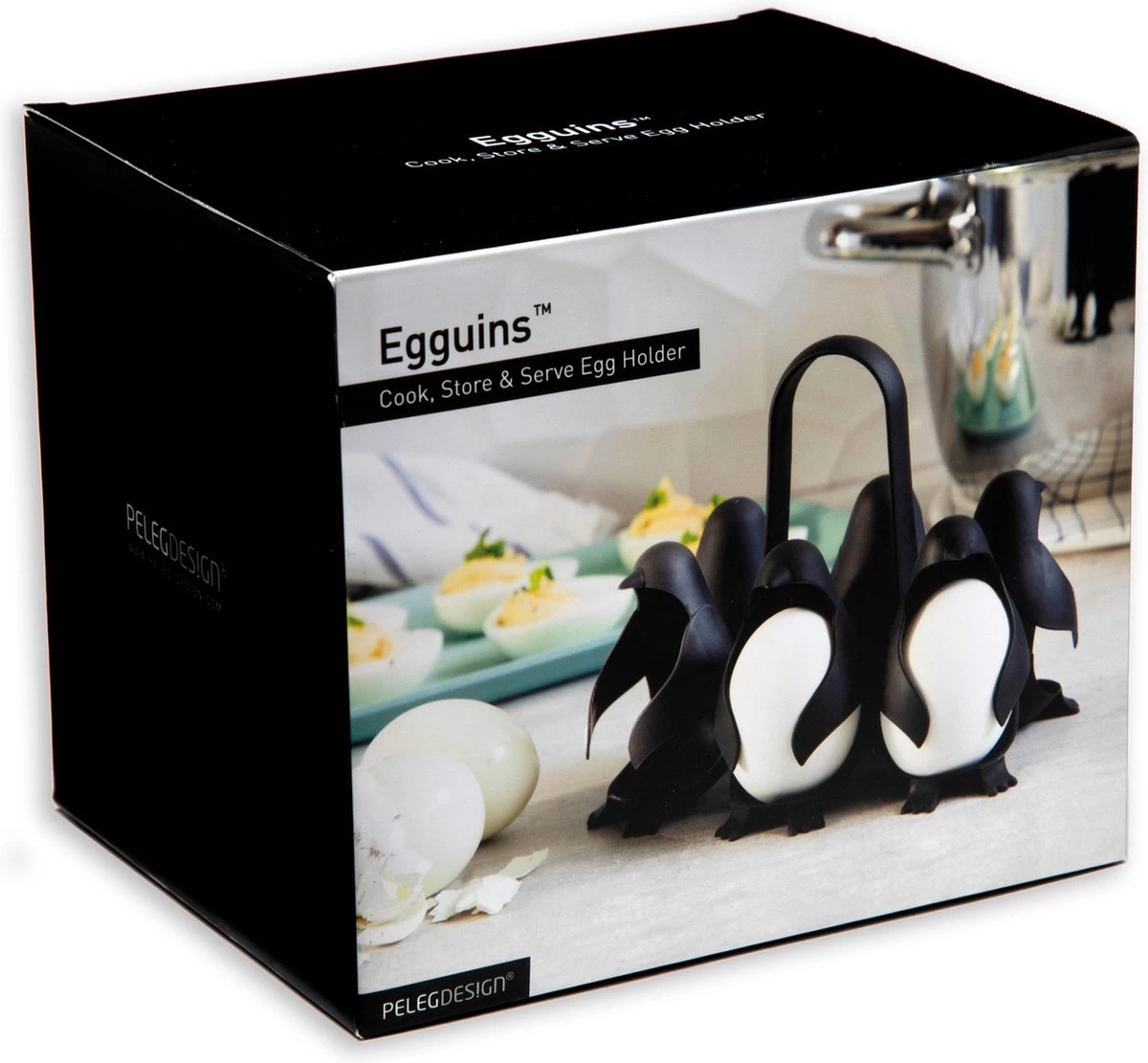 Egguins eierhouder van Peleg Design. Eierhouder in de vorm van een groepje pinguïns. De Egguins cook, store & serve egg holder kan zes eieren tegelijk bewaren. Zet ze in de koelkast, in een pan kokend water en daarna op tafel. De makkelijkste manier om eieren in kokend water te leggen is met deze pinguïn eierhouder. De houder is gemaakt van plastic en heeft een afmeting van 14,7 x 12,1 x 12,6 centimeter.