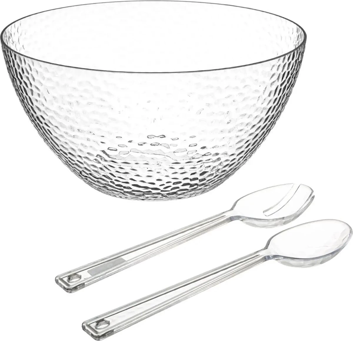 Slakom/voedsel serveer schaal gemaakt van transparant relief kunststof met een kunststof slacouvert/opscheplepels van 29 cm. Formaat: D25 cm en H13 cm. Vaatwasser bestendig.