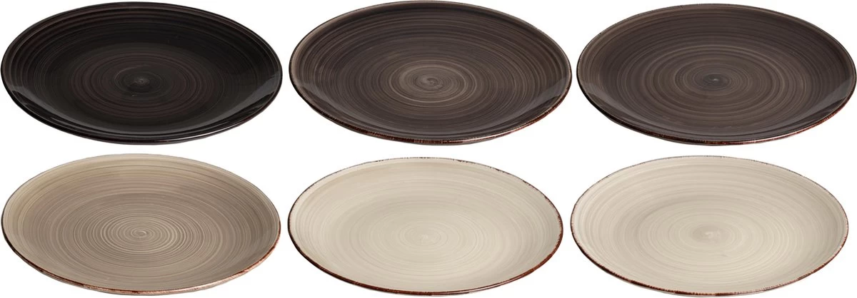Dinerborden Vintage Loft Ø 26.5 cm – 6 StuksGeef je dinertafel een stoere, vintage look met deze dinerborden! Wil je graag een keer iets anders dan je standaard witte servies, maar wil je niet teveel uitpakken? Deze borden zijn dan ideaal voor jou. De prachtige neutrale kleuren zijn anders, maar vallen zeker niet teveel op. Let wel op: deze borden worden gemixt geleverd, er kan dus geen kleur gekozen worden. Combineer de dinerborden met bijvoorbeeld de ontbijtborden, bekers of diepe borden, of kies juist voor heel ander servies.