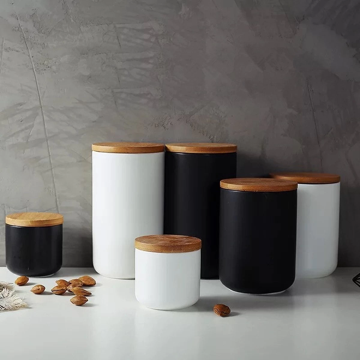 Voorraadpotten Keramiek – Suikerpot 3 stuks – Deksel Bamboe – Luchtdict Voorraadbussen Potten – Wit